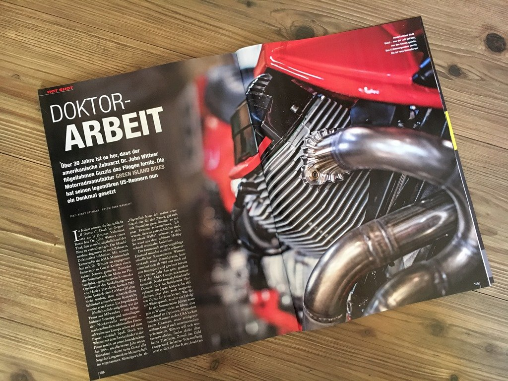 So exciting and beautiful that the picture of it found the most prominent place on the cover: the gigantic reconstruction of a Moto Guzzi Le Mans IV 1000 in the style of the racing motorcycles of the ingenious US tuner Dr. John Wittner of Green Island Bikes.